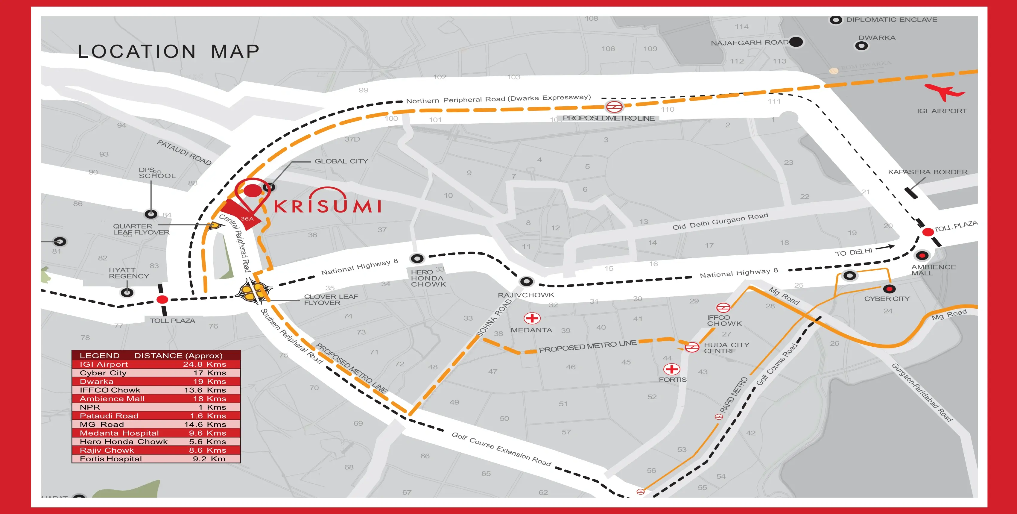 Krisumi Waterside Residences – The Forest Reserve is located in Sector 36A, Dwarka Expressway, Gurugram. The project is just 2 minutes away from the planned Global City, making it a prime location with strong future appreciation potential.